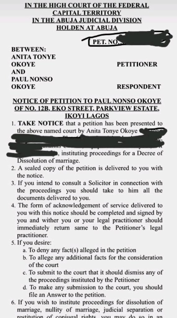 The supposed leaked divorce papers show that Anita Okoye filed it recently and is waiting for her now estranged husband Paul Okoye (Rudeboy) to respond positively to it so they can go ahead with the divorce procedures.